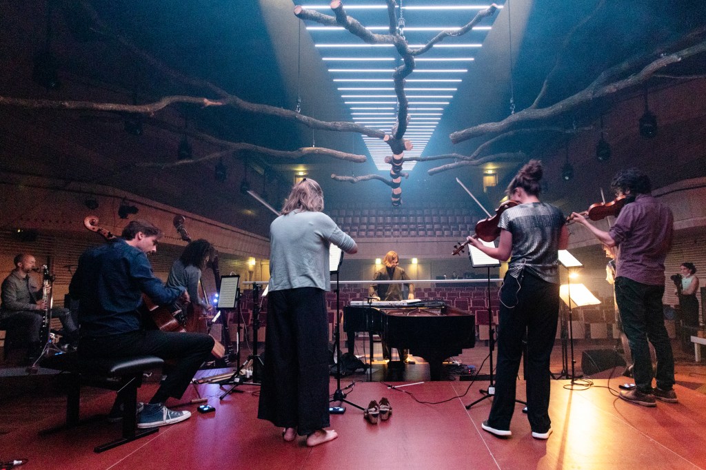 From back to front the cut parts of a single tree are fixed to the ceiling, its branches arching over the musicians. Above the tree, a set of LED-light screens, a metre wide, thirty metre long, stretches along the middle of the ceiling of the hall. The LEDs initially show black and white light patterns, resembling the patterns of early computergames, or white on black stripes of a highway, but soon the images become coloured, resembling landscapes gliding by in high-speed, as is we were riding the Maglev, the Japanese magnetic levitation train, the fastest in the world, with the Milky Way above us.