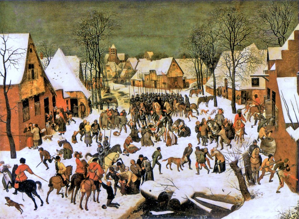 It occurred to me that the idea of child murder in combination with midwinter also can be associated with the ‘celebration’ of Mary and Joseph bringing the newborn Jesus to safety from the troops of King Herod; as pictured by Brueghel the Elder in his Massacre of the Innocents. When King Herod had learned from The Three Wise Men from the East that stars had taught them that the future king of Jews was born in Bethlehem, he ordered all newborn males of Bethlehem to be killed. Mary and Joseph fled in time after being warned by an angel, and fled to Egypt. (All other babies were killed; thank You, God.) Brueghel the Elder’s painting, set in a snow-covered landscape, was in fact an allegory on the cruelty on the Spanish occupation troops fighting the Netherlands’ independence movement. Here comes another Austrian link, as what was considered to be the original version of the painting is in the Kunsthistorisches Museum, Vienna. (It is now thought to be a copy by Pieter Brueghel the Younger. But as other authorised versions have been censored for its cruelty, this one shows the original cruel details of the mass-murder as conceived by Brueghel the Elder.