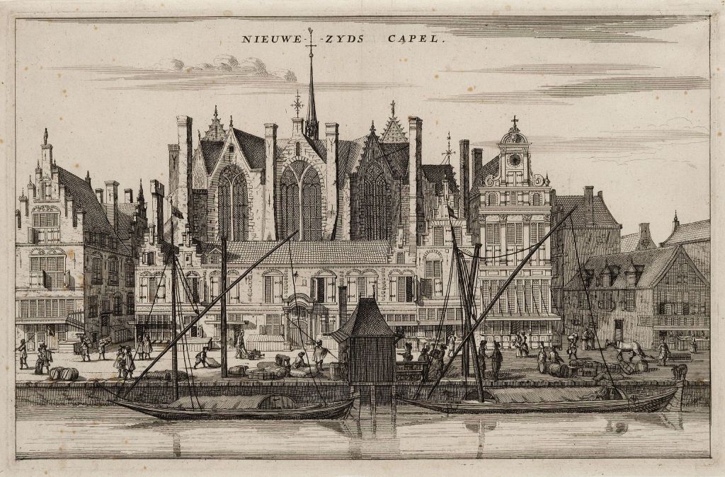De voormalige Heilige Stede/Nieuwezijds Kapel aan het Rokin, gravure door Jacob van Meurs,1663.