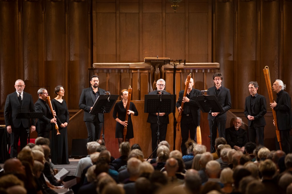 Tussen de passages die de evangelietekst volgen componeerde Selle ‘Intermedien’, waarin hij, net als later Bach in zijn aria’s en koralen, als tekst dichterlijke reflecties op het lijdensverhaal gebruikt. In deze Intermedien splitste Selle het ensemble in drie delen, en twee daarvan werden door Vox Luminis achter de zijpanelen van het middenschip van de Domkerk opgesteld.  Één ervan, inclusief het ensemble met de artistiek leider van het ensemble, de bas Lionel Meunier, stond pal achter mij; koude rillingen, waarbij ik natuurlijk wel hoopte dat de zangers, net als het publiek, goed op Corona waren getest.