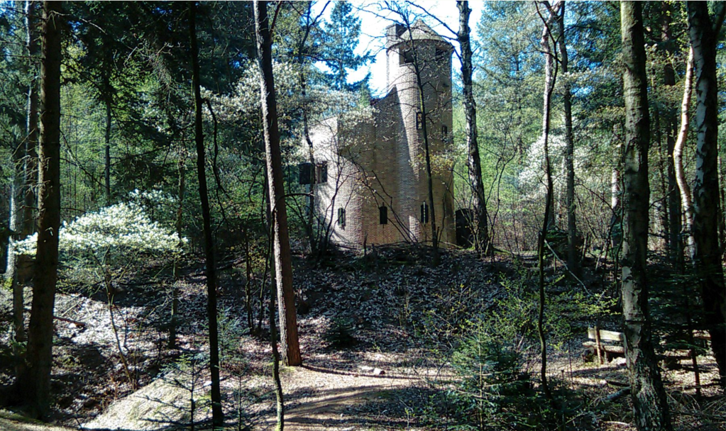 Een mogelijk equivalent van zo’n hutje leek nu ook op te doemen tegen het einde van de wandeling. Op een verhoging in het landschap staat een raadselachtig bakstenen bouwwerk, ‘Wolfsdreuvik’, gebouwd in 1938 in opdracht van D.P.R.A. Bouvy, eigenaar van het bos. De één denkt aan de Efteling of Anton Pieck, maar vanwege de schuine muren en niet rechthoekige raamkozijnen had ik ook associaties met Antroposofie en Rudolf Steiner-architectuur. Die waren in de jaren vóór de Tweede Wereldoorlog in zwang bij onze gegoede intellectuele adel en patriciërs. Als bijna-apotheose van Dans la Forêt vond hier heen klank- en lichtspel plaats dat de sfeer van sprookjes van Grimm opriep, maar inderdaad ook wel de gedachte aan de Efteling.