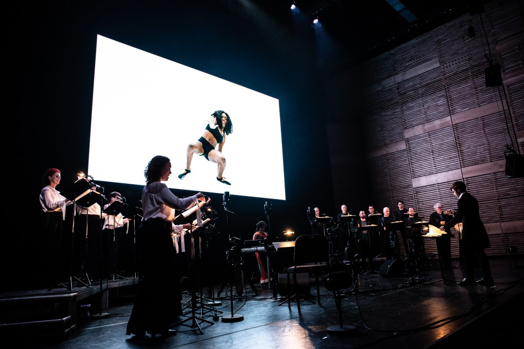 Wel vroeg kon je je afvragen of dat niet uitdraagt dat dan vooral vrouwen die er volgens de normen des tijds goed uitzien meer privilege hebben dan anderen om conform de boodschap van de voorstelling ‘in hun kracht’ te staan. Maar mooi was de video wel, mooie danseres, mooi gedanst, mooi gefilmd, mooi geprojecteerd. En tussen de dansscenes door kon met een paar beweegbare projectoren het lichtbeeld per scene worden veranderd van strak licht op de zangers naar knipperende lichtstralen gericht op het plafond tijdens de elektronische passages.