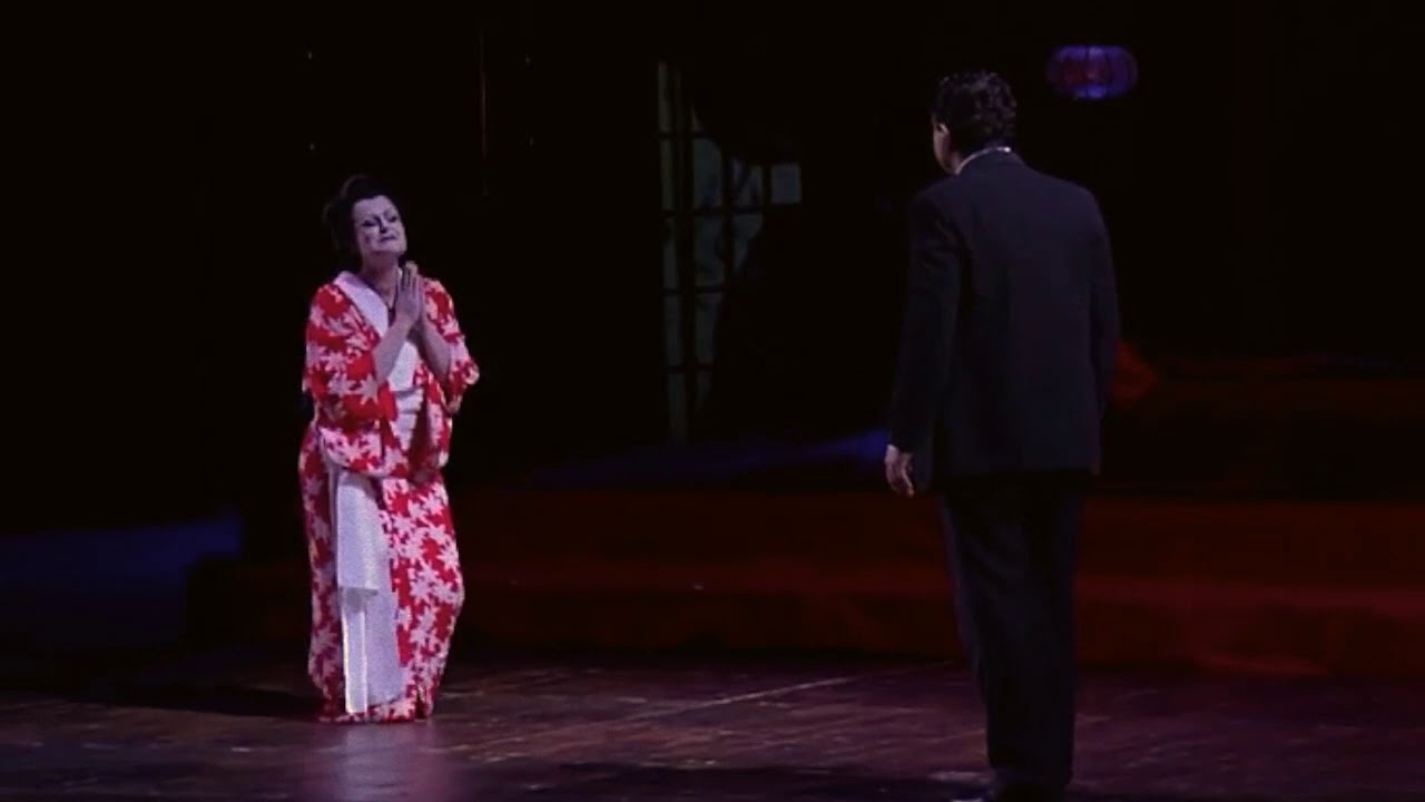 Voor de voorstelling in Livorno heeft regisseur Hiroki Ihara zich omringd met een compleet Japans productieteam aangetrokken, zo lijkt het althans al je de namen leest. Het effect is duidelijk, waar mogelijk is een Japanse sfeer gecreëerd al komt het wel wat clichématig over als je het land een beetje kent uit eigen ervaring. Een prieeltje met Mount Fuji op de achtergrond, van die dingen. De kostumering oogt zeer authentiek waarbij duidelijk wordt getoond dat de handeling zich afspeelt op de grens van twee werelden: klassiek Japans waarin de westerse moderniteit al een beetje doordringt. Zo draagt de rijke ‘playboy’ Osaka een driedelig kostuum.