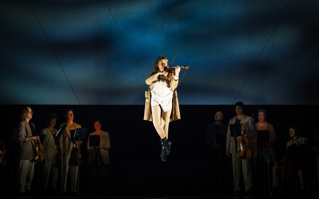 Misschien is dit een spoiler, maar een ander hoogtepunt is als Candida Thomspon al vioolspelend de lucht in zweeft, aan de kabels waarmee ook de acrobaten worden opgehesen, als een engel, al stijgt ze om dramaturgische en praktische redenen natuurlijk niet zo hoog als haar luchtacrobatiekcollega’s. Om vervolgens weer teruggekeerd ter aarde een symbiotisch bewegingsduet aan te gaan met één van de dansers.De luchtacrobatiekcollega’s gingen echt heel hoog, verticaal tegen de zijwanden op en boven het podium langs haalden ze halsbrekende toeren uit, echt, in levende lijve.