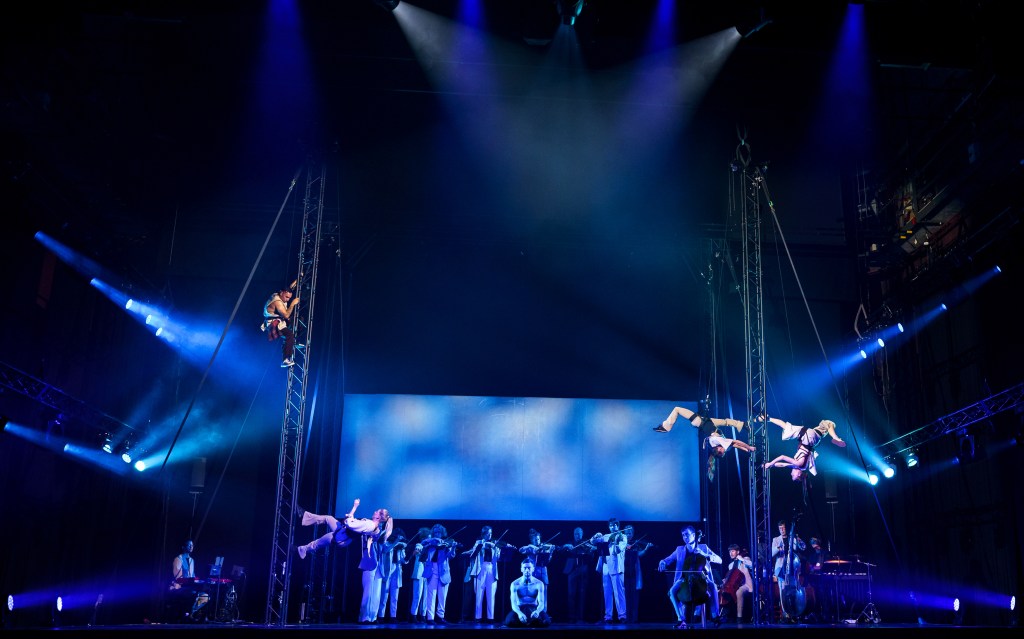 Drie fysieke jonge dansers en drie luchtacrobaten contrasteren schijnbaar met de instrumentalisten die zich bedeesd op de muziek richten. Ik moest denken aan Prénom Carmen uit 1983 van Godard, waarin de geïnternaliseerde driften van een op Beethoven studerend strijkkwartet worden geplaatst tegenover de extatische passie van een jong de vrije liefde bedrijvend bankroverspaar.