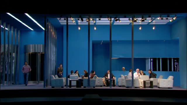 De Berlijnse productie laat een toneelbeeld zien in helblauwe tinten, er komt geen andere kleur aan te pas wat het geheel tamelijk kil en afstandelijk maakt. In een reeks met elkaar verbonden glazen ruimtes zien we een hotelkamer, een lobby met draaideur, de hotel lounge en nog een kamer. In de lounge zitten voortdurend keurig geklede gasten wat te praten, zonder zich iets van het opgewonden gedoe om hen heen aan te trekken. De kostumering is redelijk eigentijds met de markies in een lila sweater, Babulenka met bontmuts en Aleksey in een windjack met capuchon.