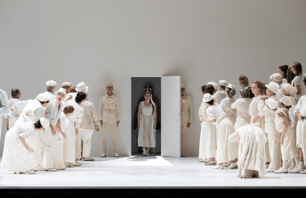 Christof Loy benadrukt op verschillende momenten in zijn regie de religie in het werk. Hij laat het volksfeest ter gelegenheid van de verwachte aankomst van de beoogde nieuwe leider er uit zien als de voorbereidingen voor Christus’ Intocht in Jerusalem. Ik moest bij het beeld ook denken aan Ari Asters film Midsommar, waarin de protagoniste, gespeeld door Florence Pugh, tegen wil en dank tot koningin van een gruwelijke sekte wordt gekroond.