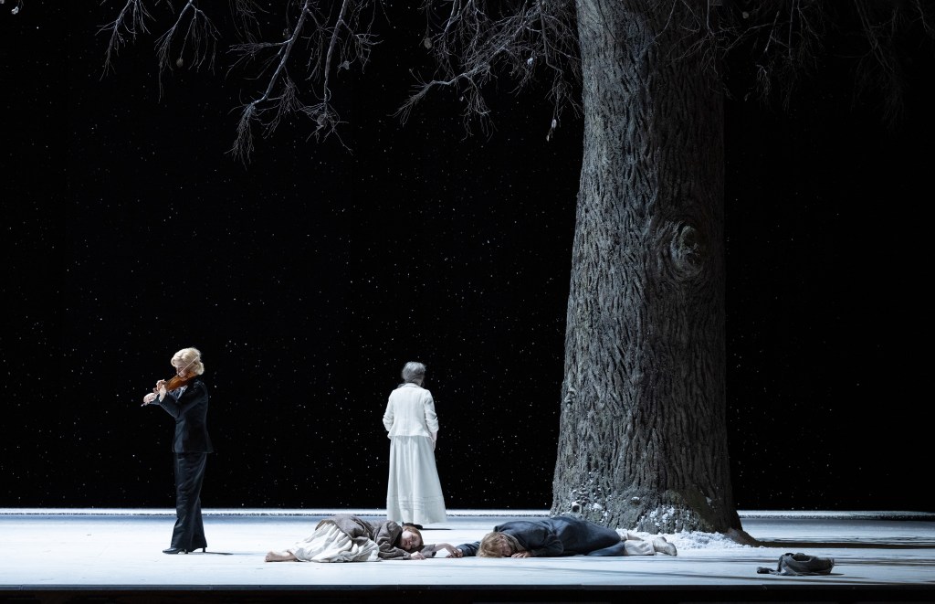 Rechts staat in elk van de bedrijven een lindeboom, die eerst in blad staat, maar in het derde, winterse bedrijf kaal is. Zo geslaagd als de scenische uitvoering is, zo geslaagd was de muzikale uitvoering; tot in de kleinste rollen, namelijk letterlijk, de kinderen.