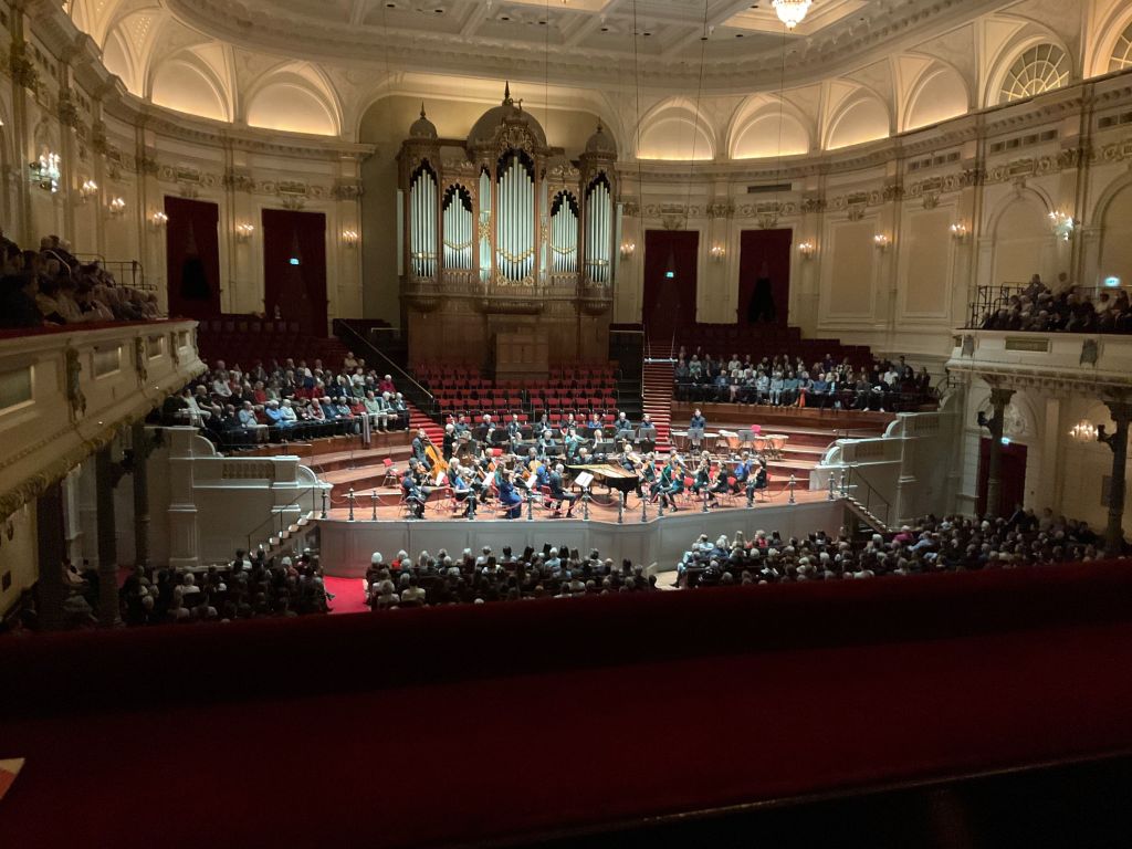 Lucas Jussen en het Nederlands Kamer Orkest kozen, mede geïnspireerd door zich steeds wijzigende instellingen, voor een verrassende opstelling, de piano in het midden, pianist met gezicht richting zaal, eerste violen links, tweede violen en altviolen rechts, blazers over de hele breedte in de achterflank, en concertmeester en pianist leiden om de beurt. Ik telde behalve de solist net iets meer dan dertig musici, kleine bezetting dus.