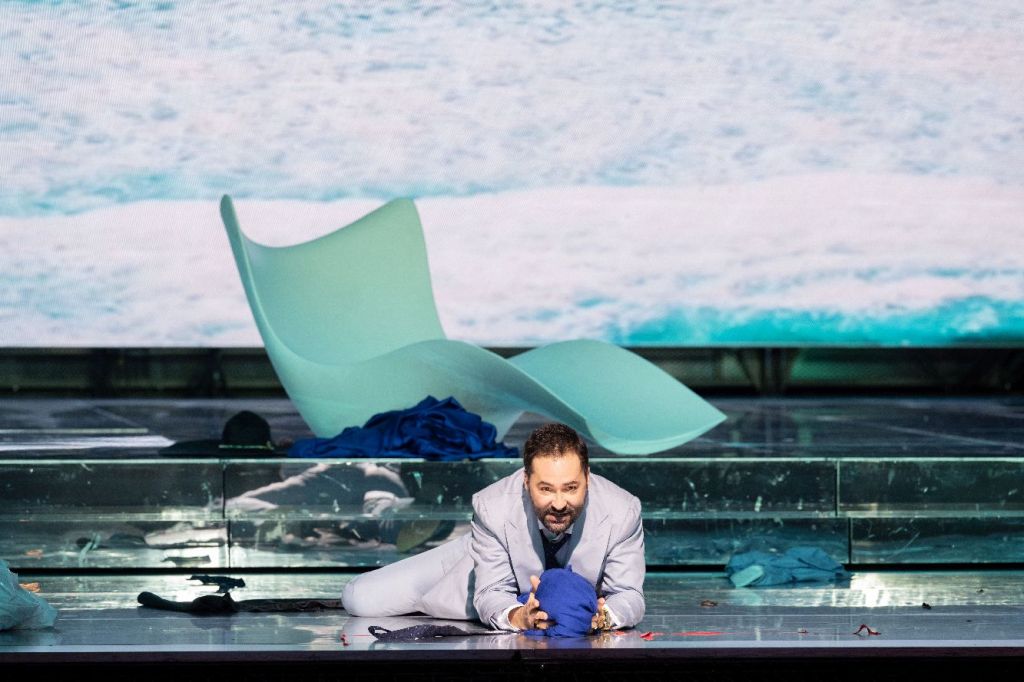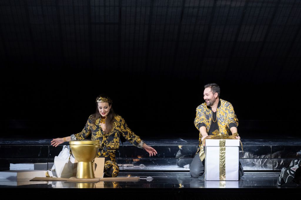 De regie plaatst de handeling in een omgeving die wordt beheerst door ‘snakes in suits’, psycho’s die geilen op macht en obscene rijkdom en letterlijk en figuurlijk over alles en iedereen heenlopen om hun doel te bereiken. En die insteek heeft Bieito gekoppeld aan een land als Saoedi Arabië. Hij biedt ons twee aanknopingspunten om zelf tot die constatering te komen. Ten eerste wordt het hoofd van Pompeo opgevoerd alsof het door een shredder is gehaald, een verwijzing naar Kashoggi. Ten tweede oogt het high tech decor als het Saoedische paviljoen op de Expo in Dubai.