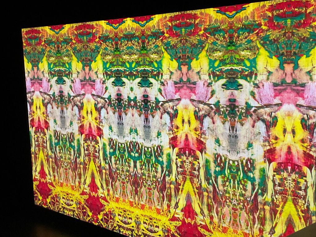 Die figuren leken soms te evolueren tot een LSD-trip door onze ingewanden, oneindige reeksen roze, paarse, groene en gele boeddha’s, een bergdorp in de Himalaya vol uitbundig versierde hindoetempels, een stoffenmarkt in Jodhpur, een competitie welke kraam de mooiste suikerspinnen en zuurstokkramen heeft tijdens carnaval in Mexico, een bloemencorso in Lagos, enzovoort. En dat allemaal geconstrueerd via eindeloos in fractals opgedeelde strepen en figuren.