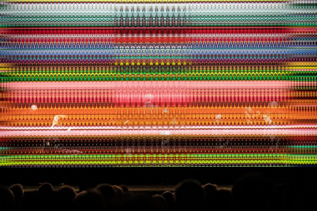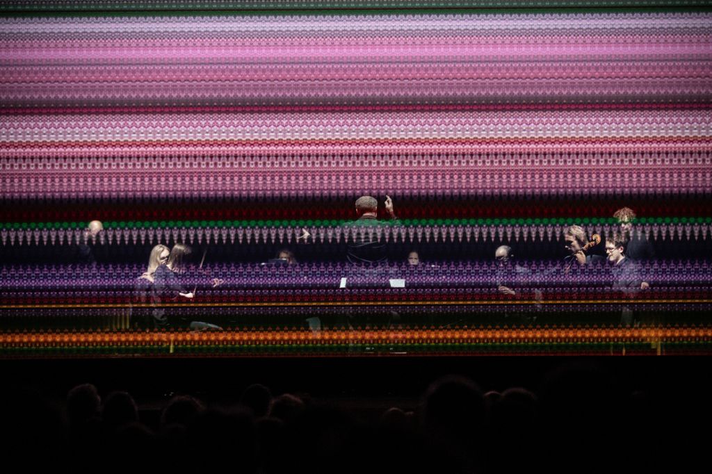 Het Ensemble Intercontemporain zal Reichs muziek waarschijnlijk net zo mooi gespeeld hebben als het ASKO het gisteravond deed. Maar tussen de New Yorkse en deze uitvoering is er een heel belangrijk verschil, dat zowel het concept van het samengaan van beeld en muziek als vermoedelijk ook de akoestiek ten goede kwam: scenograaf Theun Mosk plaatste het projectiescherm vóór de musici op het podium van het Muziekgebouw aan ’t IJ en ontwierp een belichting waarmee de musici af en toe oplichtend door het scherm met de filmprojecties heen te zien zijn, daarmee ook de golvende bewegingen in de partituur uitlichtend.