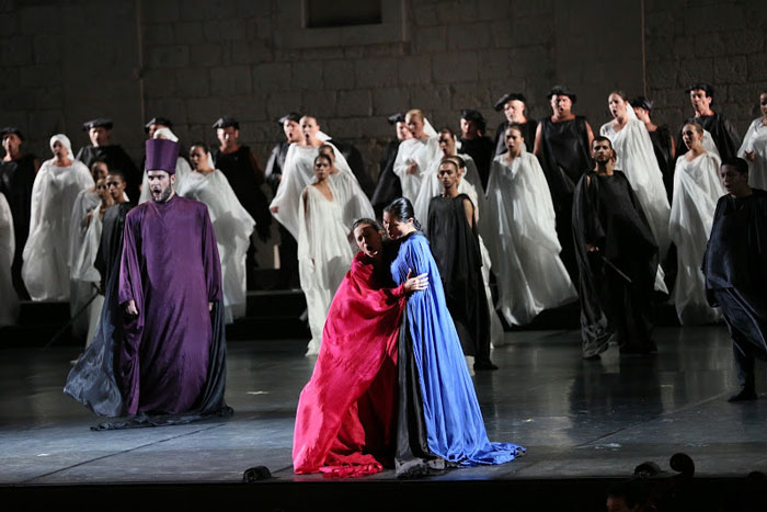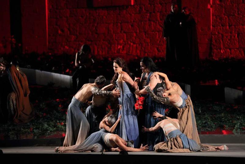 Pier Luigi Pizzi was aangetrokken voor de regie en de kostumering. Het decor beperkte zich tot een plankier voor de wand van het paleis en een catwalk waarop de zangers tussen orkest en publiek in het nodige konden zingen. Feitelijk gebeurt er heel weinig in deze versie, het is vooral veel zang. Om die reden heeft Pizzi een ballet aan het koor toegevoegd en natuurlijk is ook zijn favoriete ballerina Letizia Giuliani van de partij.