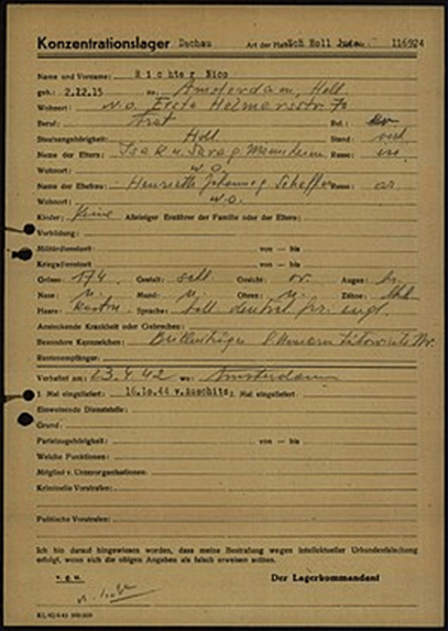 Registratieformulier van Nico Richter als gevangene in nazi-concentratiekamp Dachau