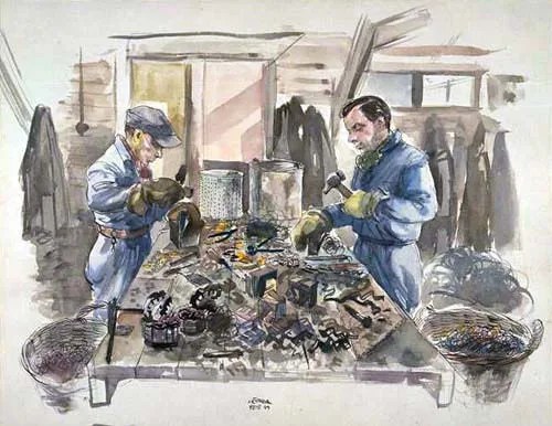Van Wesel en Kannewasser tijdens sloopwerkzaamheden in Kamp Westerbrk, tekening van Leo Kok uit 1944