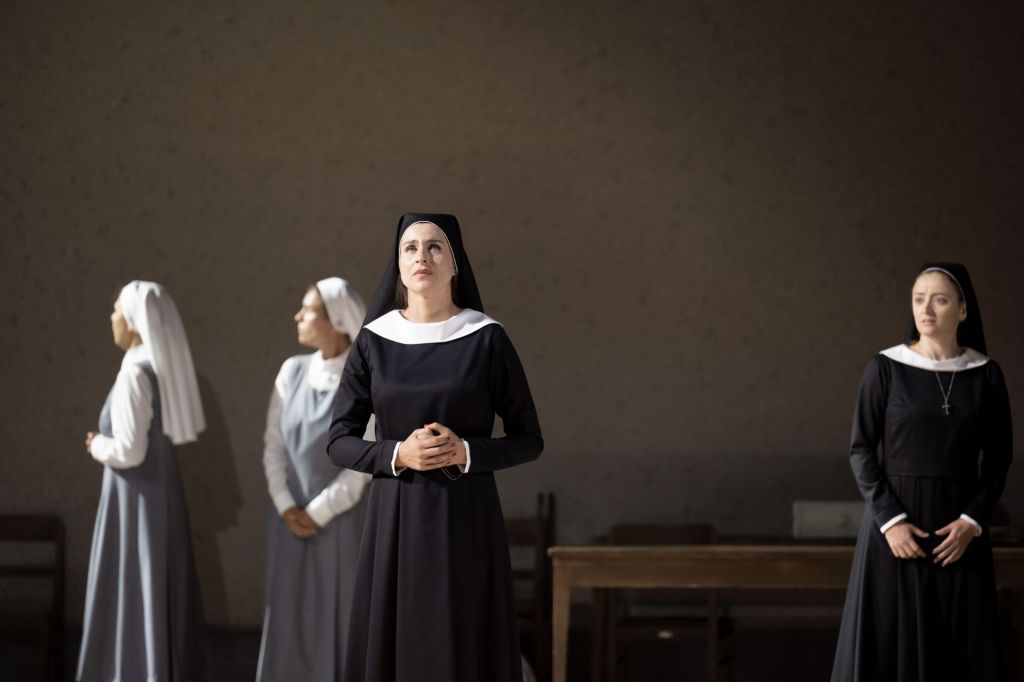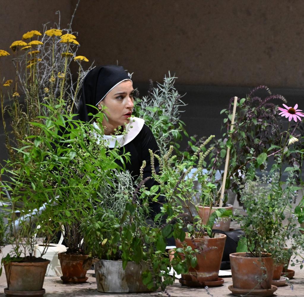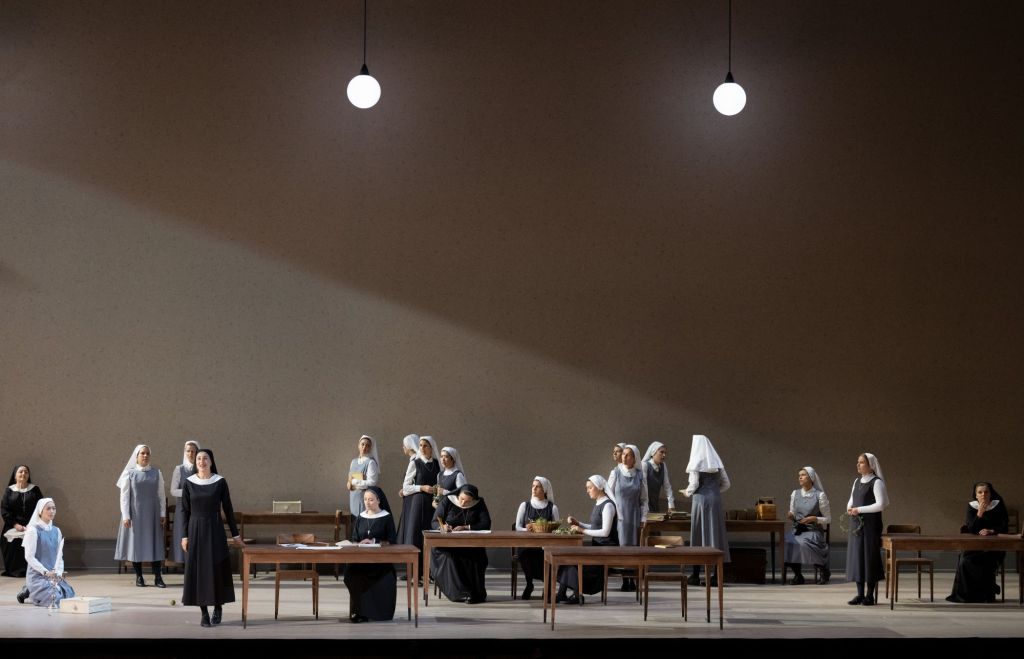 Net als in de voorgaande delen gebruikt Loy ook in Suor Angelica de volledige breedte van het toneel. Met al die rondlopende nonnen is dat toch redelijk gevuld, ondanks het vrijwel ontbreken van decorstukken. Behalve een achterwand met een deur is er weinig te zien. Een paar stoelen en een tafeltje waar Angelica aan zit. Verder een minimaal hoekje met kruiden. Het is allemaal erg naturalistisch en pas op het einde merk je dat de regie de handeling zich laat afspelen in het heden. Dat heb je met die tijdloze habijten.