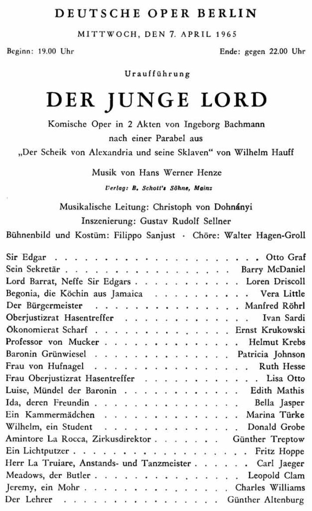 From DER JUNGE LORD by Ingeborg Bachmann and Hans Werner Henze – Edith Mathis with Loren Driscoll and Bella Jasper © Archiv Deutsche Oper Berlin, April 1965