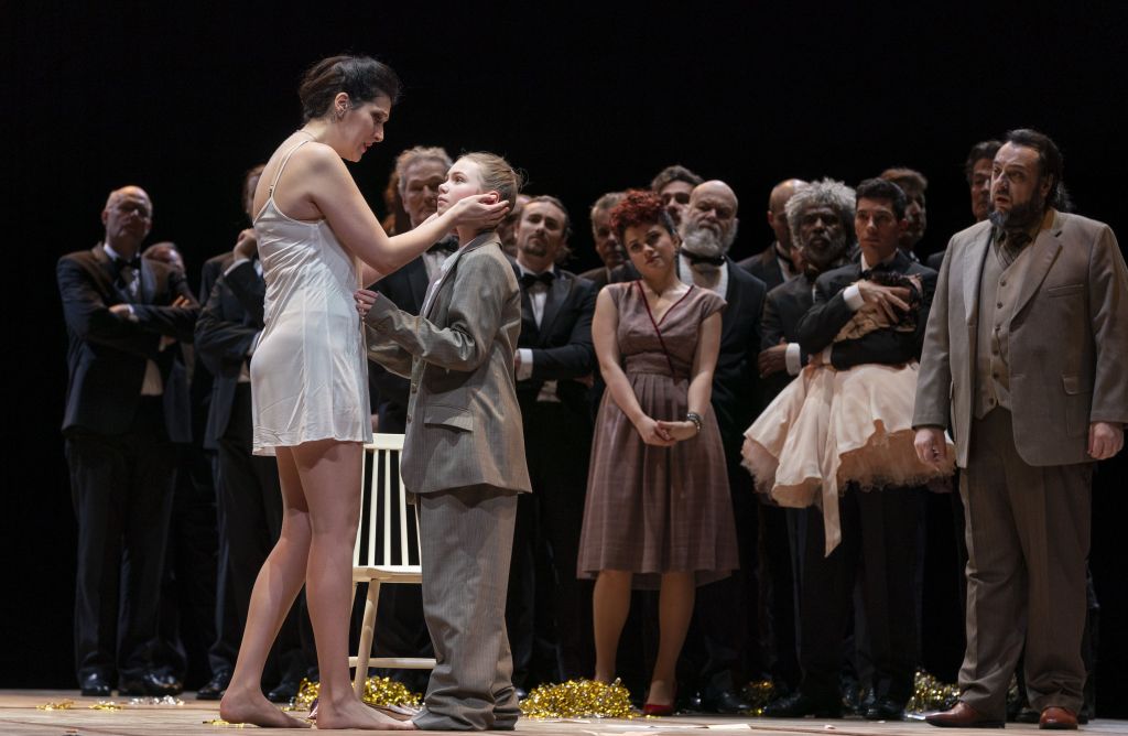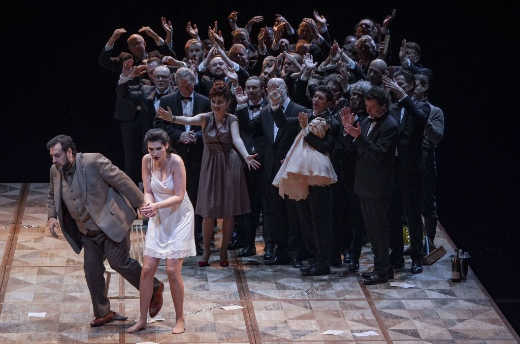 De Violetta in deze voorstelling wordt zeker bespeeld, maar ze bespeelt de wereld om haar heen net zo goed. De twee scenes in het Parijse uitgaansleven openen met tableaux-vivants met de leden van het koor, die pas op een teken van Violetta tot leven komen. En, ook al horen we Violetta nu al hoesten aan het eind van het voorspel tot de eerste akte, waaruit blijkt dat ze wel degelijk iets onder de leden heeft, in de derde akte zien we haar haar polsen en hals bewerken met een Marina Abramoviciaans scheermesje. En nee, dit komt echt niet al te bedoelerig over, het werkt.