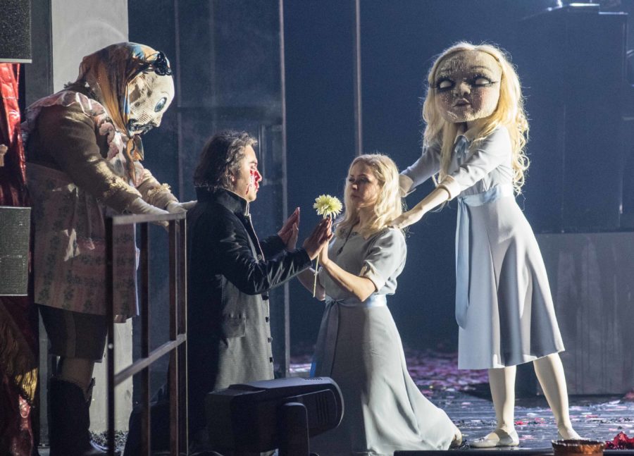 Ranisch en Falko Herold (decor en kostuums) zijn er goed in geslaagd die twee verhalen tot een geheel te smeden, met Iolanta als verbindende schakel. Tijdens de scènes uit Mavra begeleidt een bühneorkestje de spelers die onherkenbaar zijn gemaakt door er overmaatse koppen op te zetten waardoor ze eruit zien als karikaturen uit een poppentheater met bedrieglijk kleine lijven.