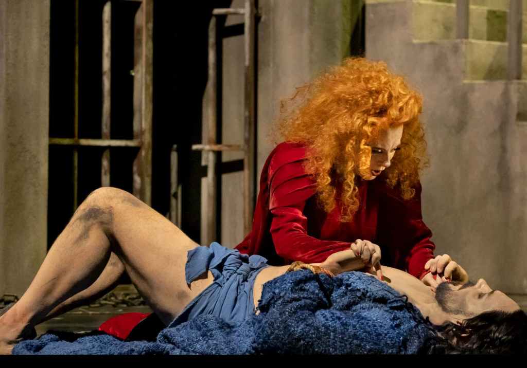 Interessanter is wat Mondtag met het werk doet als regisseur en dan vooral waar het de interactie tussen Salome en Jochanaan betreft. Klassiek is de gedachte dat Salome zich door alle mannen aan het hof bekeken en begeerd voelt, vooral door haar stiefvader Herodes. Eigenlijk is ze al te oud om als ongetrouwde vrouw van 15 zo maar los rond te lopen gelet op de mores van twee millennia geleden. De huwelijkse status zou haar in elk geval tegen Herodes hebben kunnen beschermen. Maar goed, de page (hier gespeeld door een vrouw) is verliefd op de kapitein van de wacht Narroboth die op zijn beurt verliefd is op Salome. De page waarschuwt dat hij niet zo naar Salome moet kijken, daar komt onheil van. Zal wel maar eigenlijk is ze gewoon jaloers. Als Salome die gevangen prediker wil zien die haar moeder zo leuk beledigt stuit ze op het verbod van Herodes. Maar het is Narroboth die dat moet handhaven en hem kan ze met een natte vinger lijmen. En zo komt er een derde man in het spel.