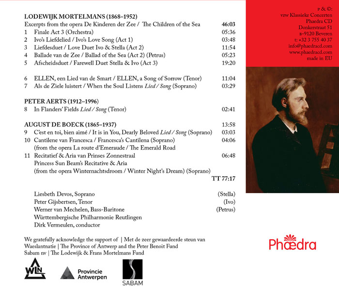 ˜Ellen” on lyrics by Frederik van Eeden (Gijsbrecht) and ˜Als de Ziele luistert”/ “When the Soul listens” (Devos) complete the ˜Mortelmans segment”, but there are also songs and arias by Peter Aerts and August de Boeck.