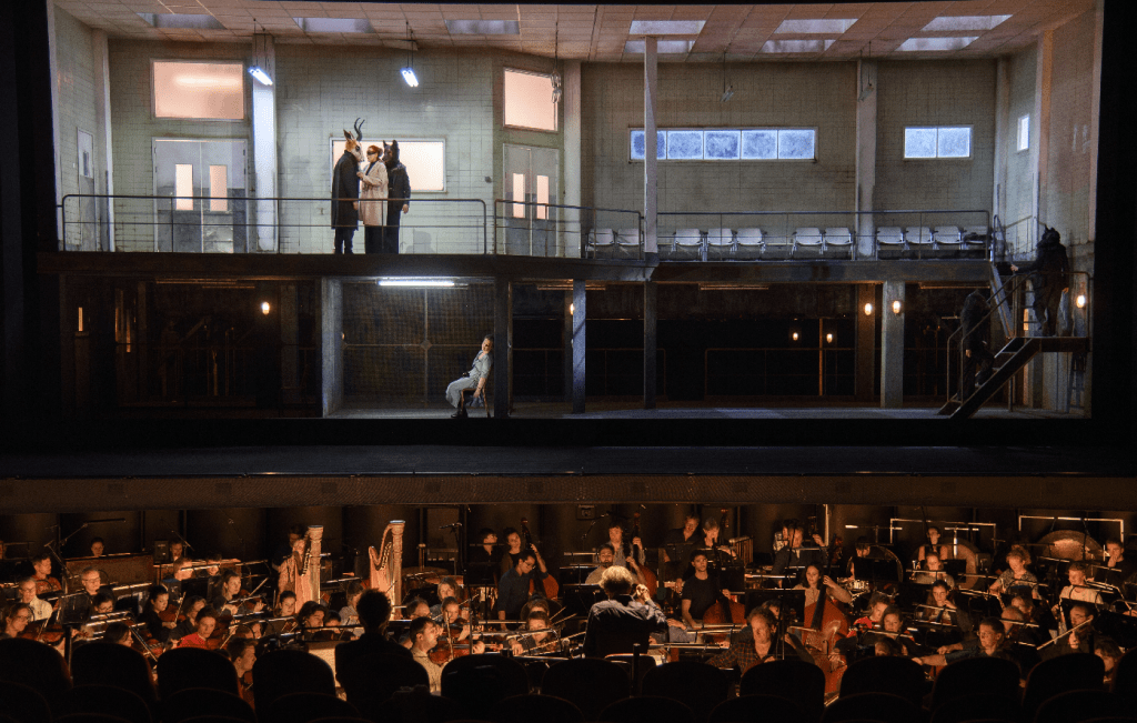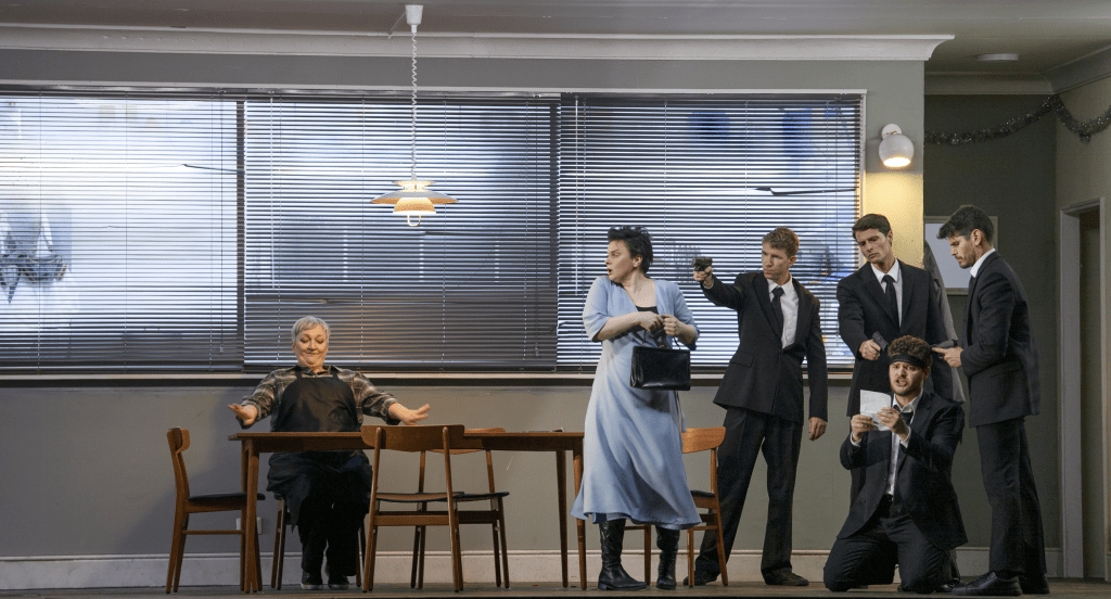 Op het podium zien we het op en neer beweegbaar hyperrealistisch ‘twee-verdiepingen’-decor zoals we dat kennen van Katie Mitchells eerdere regieën bij De Nationale Opera van George Benjamins Written on Skin (2012) en Janáčeks Jenůfa (2018). Nu verbeelden ze een upstairs-downstairs wereld, conform de werelden van de twee centrale ‘paren’.