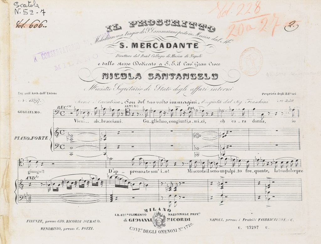 Het prachtige platenlabel Opera Rara zet zich al jaren in om onbekende opera’s uit met name de belcanto periode weer nieuw leven in te blazen. Zo verschenen bij dit label van Mercadante reeds opnames van Maria Stuarda, Zaira en I Normanni a Parigi (highlights), Emma d’Antiochia, Orazi e Curiazi en Virginia (compleet). Allemaal zeer gewenste uitgaves die een beter beeld van de veelzijdigheid van de componist hebben gegeven. Onlangs voegde ze een opname van de opera Il Proscritto toe aan de catalogus. De opera, op een libretto van Salvadore Cammarano (bekend van o.a. Lucia di Lammermoor, Il Trovatore en Roberto Devereux), ging op 4 januari 1842 in Naples in wereldpremière. Één van zijn latere werken.
