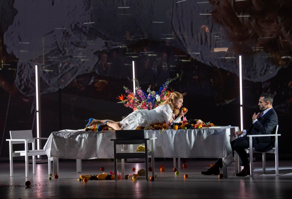 Als je Chawa’s karaktertekening in het libretto als misogyn wil zien, dan verandert Bieito daar weinig aan. Ze moet de hele tijd verleidelijk zijn, ze loopt heupwiegend rond, komt met de ene na de andere sensuele jurk opkomen, enz. Maar dat doet Dasch overtuigend.