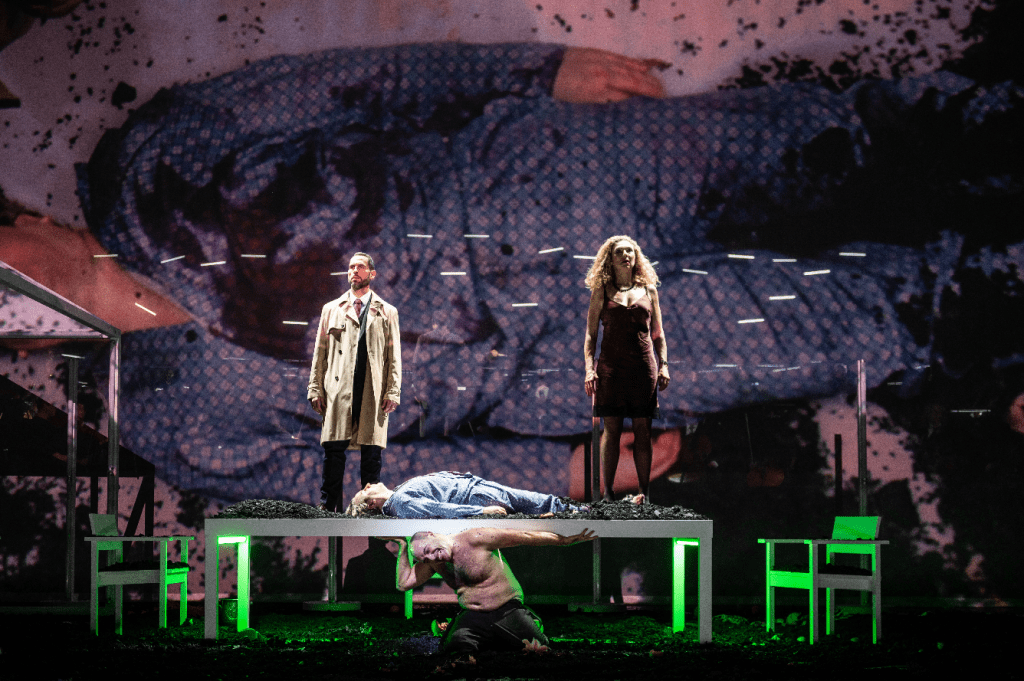 Chabel brengt een lam mee naar huis, het Lam Gods. Maar het is een onooglijke vuilwit-pluchen speelgoedbeest. Als een verwend kind snijdt Chabel het beest aan stukken. “Het offer” noemt Chabel het. Het eerste offer, volgens het libretto, het tweede offer wordt Chabel even later zelf, wanneer hij, Bijbel-conform, door Kajin wordt vermoord. De Jezus-analogie ligt er duimendik bovenop, en Bieito buit die gretig uit. Chabels ‘kindsheid’ belet Bieito overigens niet om voorafgaand aan de broedermoord een prachtig in scène gezette seksscène te hebben, met Chawa, maar intussen ook met Kajin, en met alle twee tegelijk.