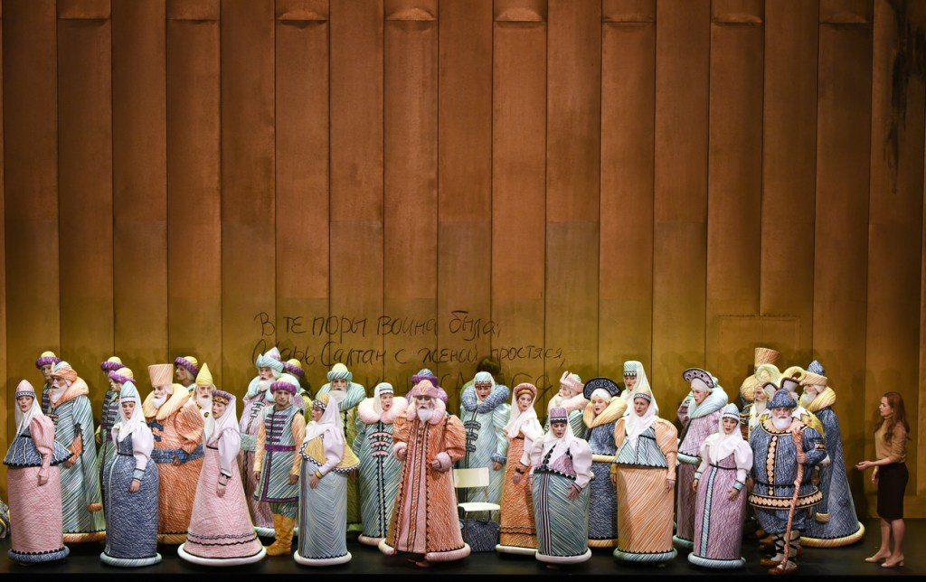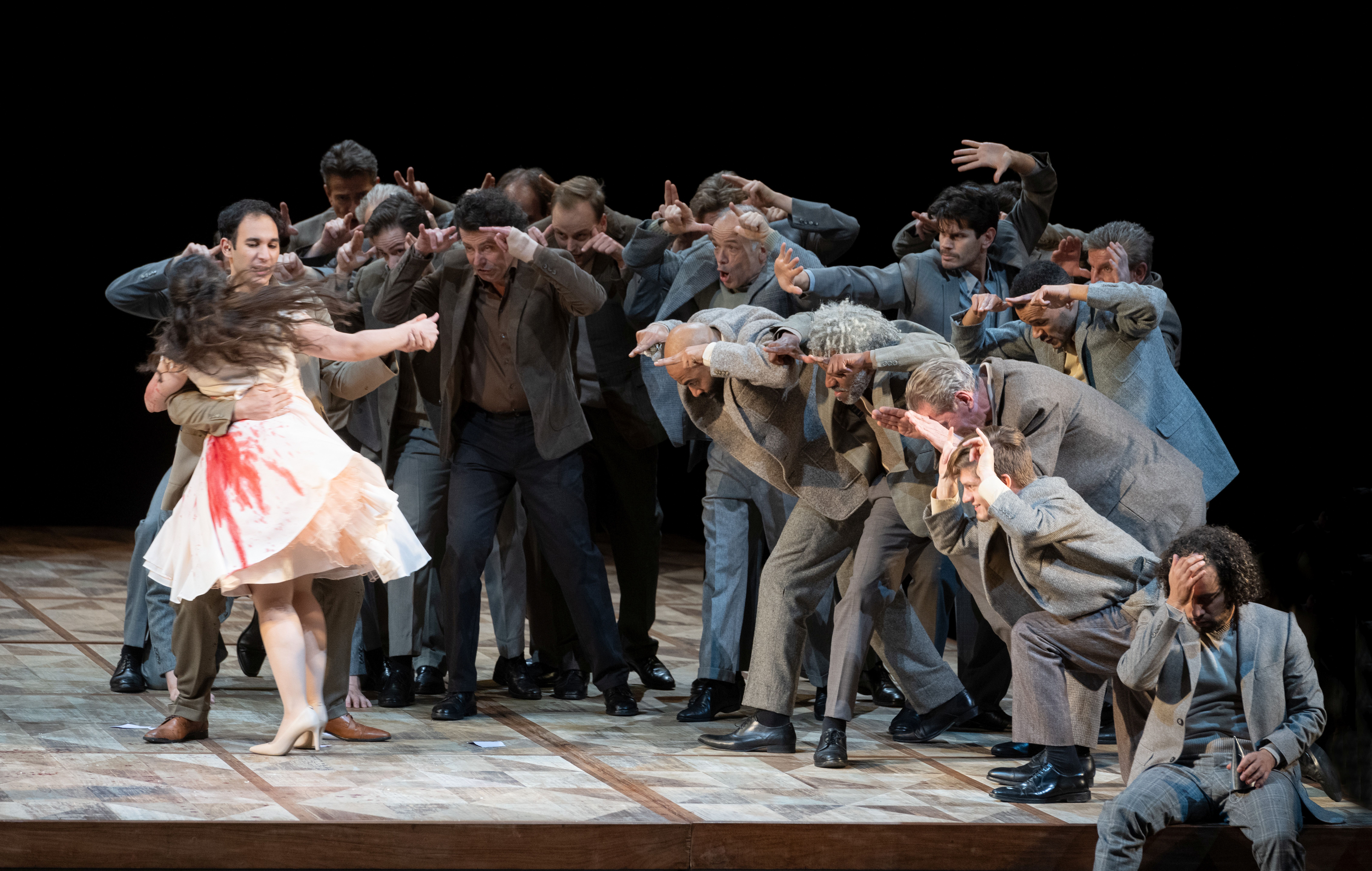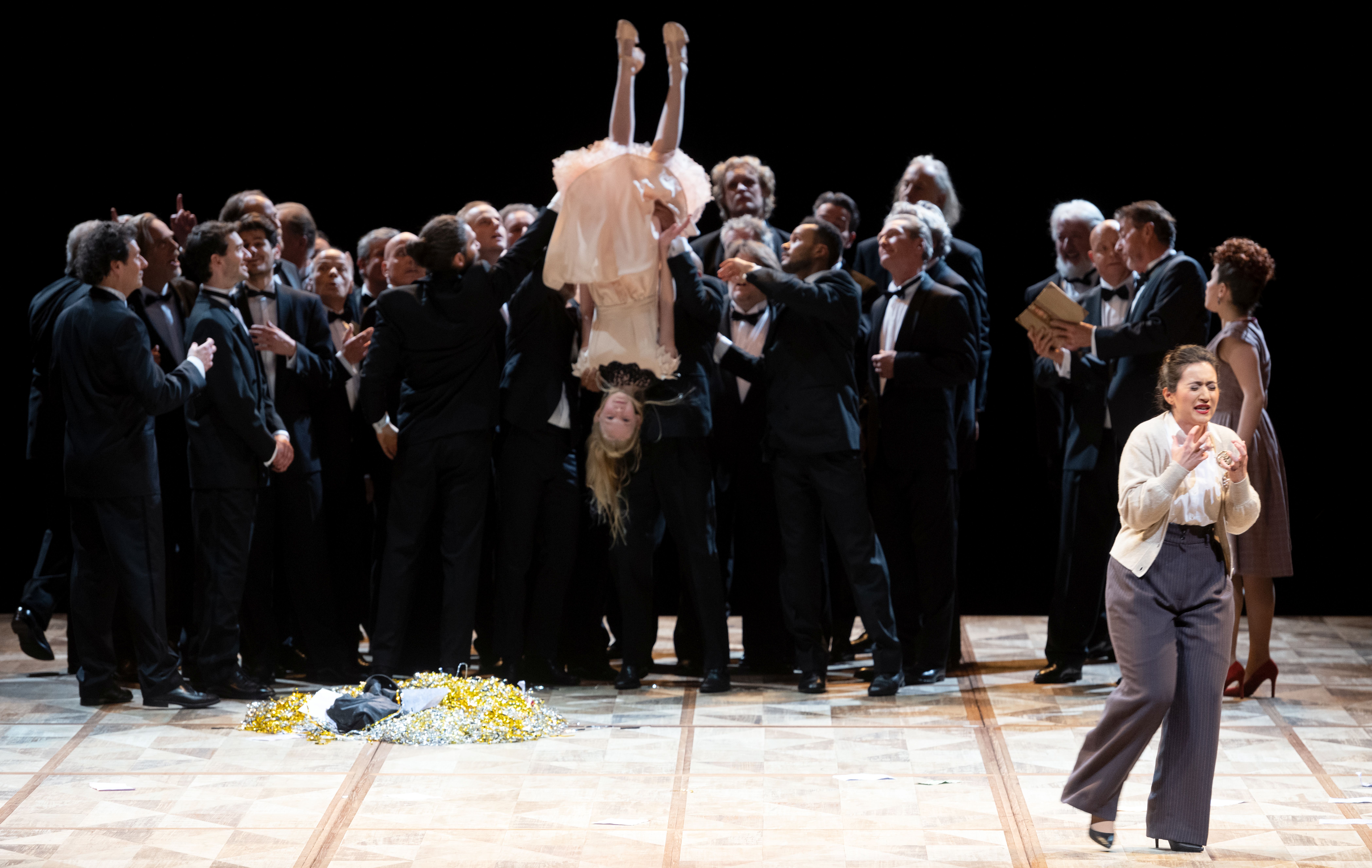 In de bak zit de Wiener Plhilharmoniker. Op het toneel zien we de heren van het Wiener Staatsopernchor en dirigent Mirga Graźinytè-Tyla heeft de muzikale leiding.