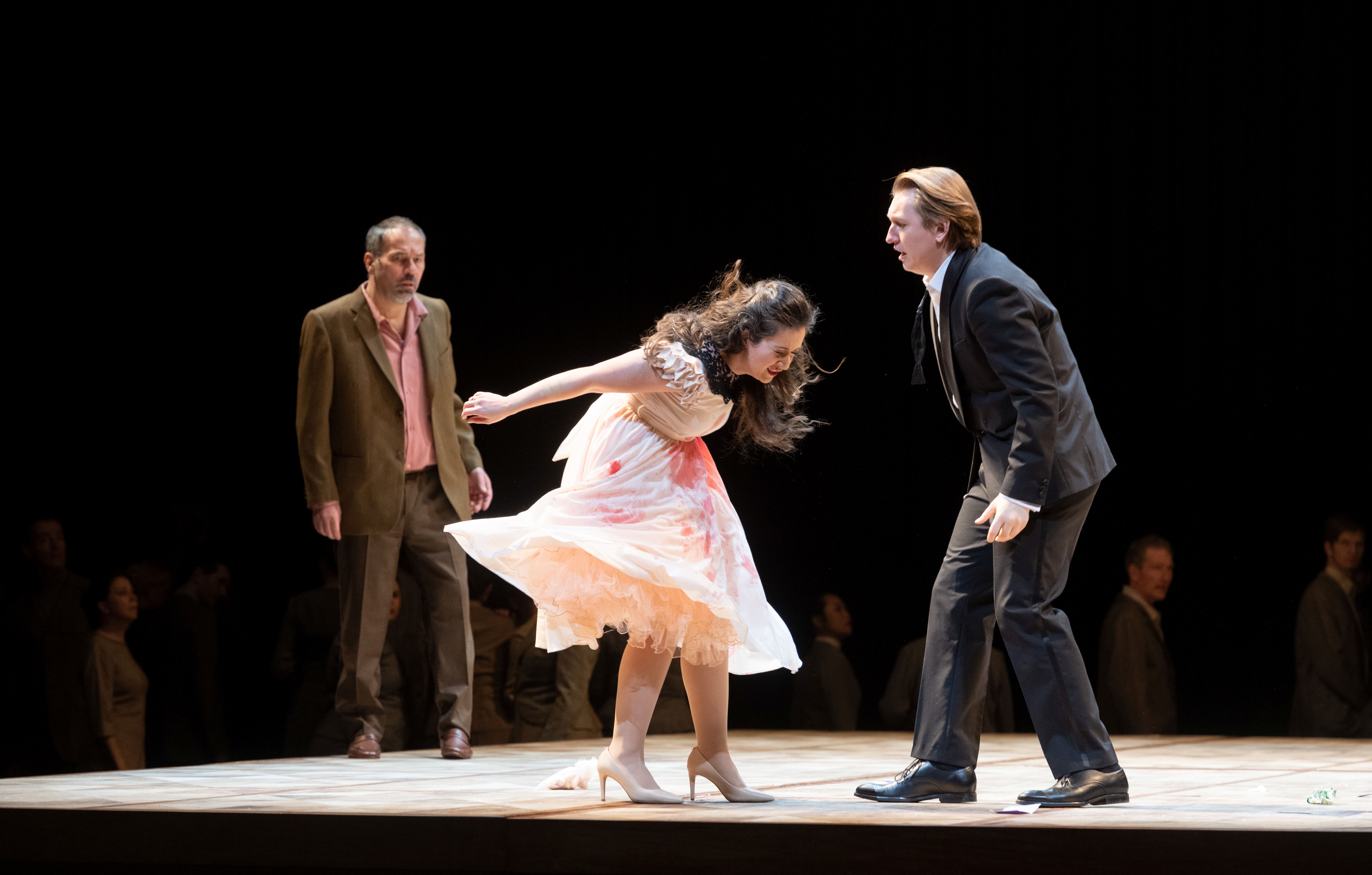 Als Nastasya is ze helemaal in haar element en weet met gemak een personage te creëren waarop al die door mij genoemde etiketten van toepassing kunnen zijn. Haar uiterlijk draagt hier aan bij, op de portretfoto die bij aanvang in beeld wordt gebracht ziet ze er onweerstaanbaar uit en eigenlijk hoeft nauwelijks nog te zingen om de rol over het voetlicht te brengen. Al is die gifgroene jurk in de tweede akte natuurlijk wel een enorme miskleun. Ook al is haar zang zodoende bijna een bonus, ook op dit punt scoort ze een voltreffer. Haar beste optreden tot nu toe dat ik heb gehoord en gezien.