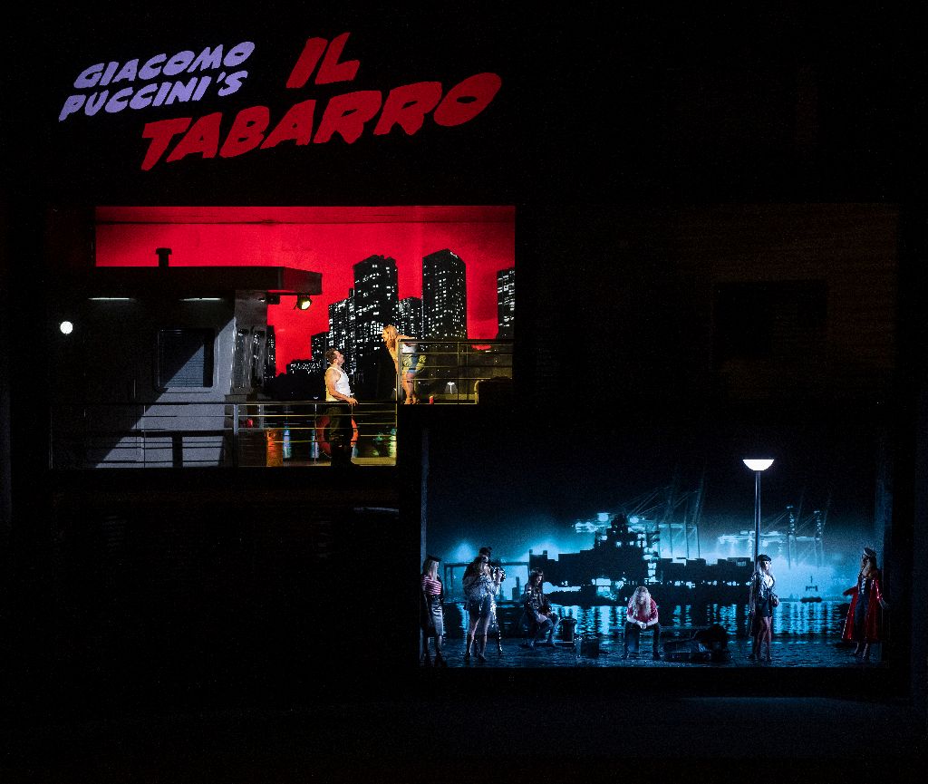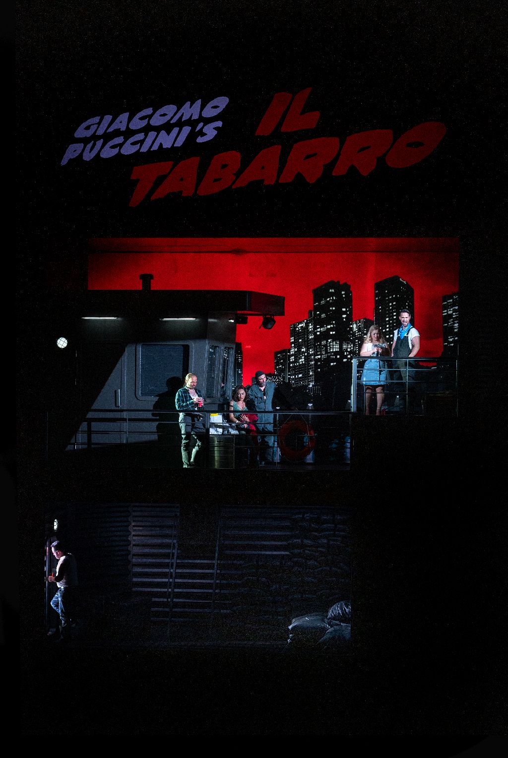 Het decor in Il tabarro bestaat uit vier delen: het dek en het woonvertrek van Michele en Giorgetta boven, het ruim en de kade beneden. Het ziet er uit als een verfilmd stripverhaal en die gedachte moeten we even vasthouden. Het dek linksboven ziet de meeste actie, jammer genoeg staat iedereen nogal hoog achter een reling waardoor het contact met de zaal wat wordt bemoeilijkt.