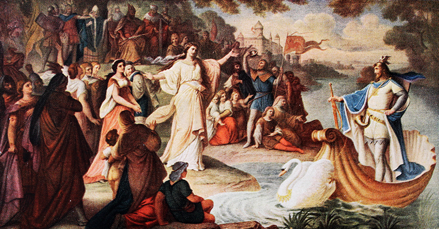Lohengrin arrives in Antwerp, painting from the Lohengrin mural cycle, by August von Heckel , Neuschwanstein Castle