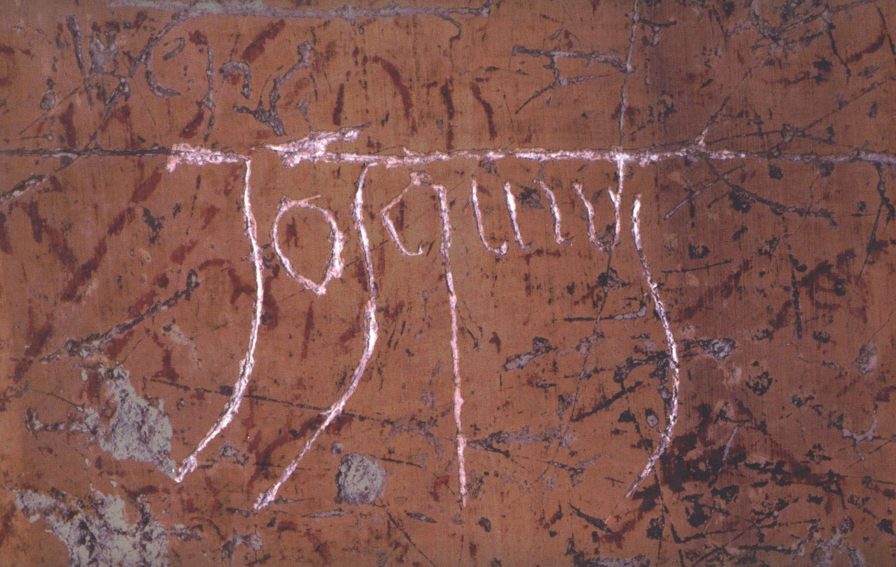 Josquins naam geschreven in de pleistermuur van het zangersbalkon in de Sixtijnse Kapel. Mogelijk door Josquin zelf aangebracht, wat iedere kapelmeester deed. (NB Michelangelo had zijn fresco’s toen nog niet aangebracht; deze graffiti was geen vandalisme.)