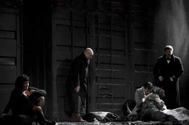 De bühne was veranderd in een balzaal met kristallen kroonluchters, goud, glitter en feeëriek van licht. De feestvierders (het koor en de figuranten, gestoken in avondkleding) waren gezeten aan tafeltjes met champagne. Een duidelijke knipoog naar de beroemde ‘Mecenaatsdiners’ in De Munt.