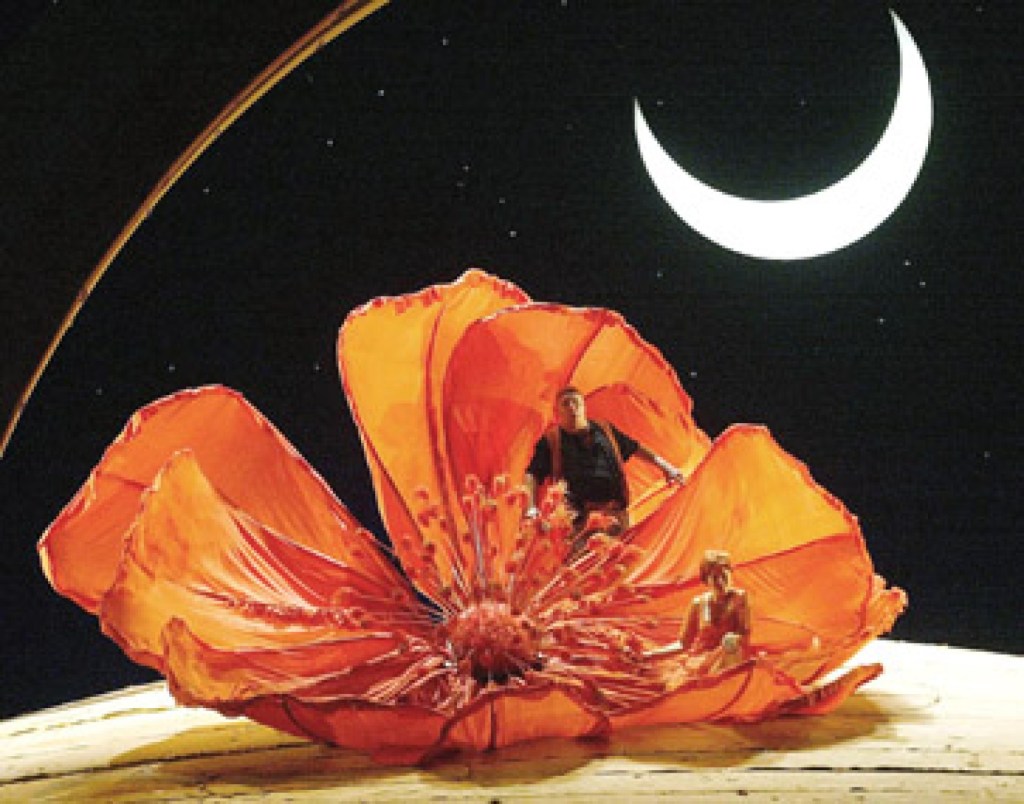 De enscenering die regisseur Dieter Dorn maakte voor de Salzburger Festspiele is oogverblindend mooi. Niet in de laatste plaats door de decors en kostuums van Jürgen Rose en de belichting van Tobias Löffler. We zien een koepelvormig decor met een ring bovenaan. Het oogt als de bovenste helft van een vogelkooi. In die open ring zingt de oude man. Beneden op het licht gewelfde grondvlak spelen de scènes zich af. Door veelheid aan exotische kostuums krijgt alles het oriëntaalse tintje dat zozeer bepalend is voor de verhaallijn.