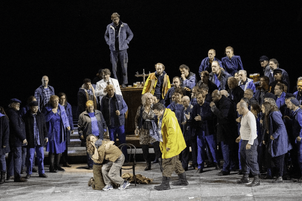 Halverwege wordt de song wreed onderbroken door een klankcluster uit de orkestbak. De bak zit verscholen tussen een halfcirkelvormige podiumstellage voorlangs en het voorste deel van het grote podium achterlangs. Van het grote podium wordt de hele voorstelling lang alleen dat voorste deel gebruikt. Dat brandscherm blijft de hele voorstelling lang gesloten. Op twee deurtjes na, waardoor zangers opkomen en weer afgaan. Achter die deurtjes zien we iets van een grijs-duistere ruimte.