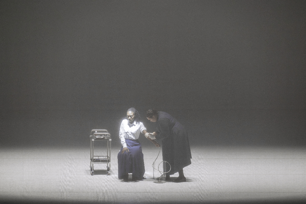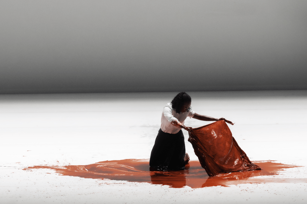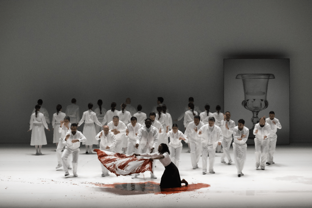 Het is dat soort contrast tussen bovenaardse schoonheid en fysieke aardse gruwelen die de voorstelling volgens mij ook probeert uit te beelden. De voorstelling speelt zich af in een volmaakt strakke enorme ruimte, het hele podium van het Muziekgebouw wordt gebruikt. Die ziet eruit als een kliniek of een reusachtige gevangenis. De ruimte wordt eerst gevuld met vaag-grijs licht, vervolgens kleurt die ziekenhuis-wit en daarna bloedrood. In die steriele ruimte is het intussen één en al bloed en lichaamssappen op het toneel, maar ook gestileerd.