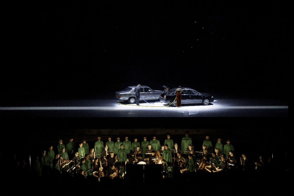 De bezorgdheid van de Nationale Opera over dat laatste sloeg vermoedelijk onder meer op de slotscène: het liefdespaar La Ninfa/Euridice en Il Poeta/Orfeo komt ieder met een auto aanrijden op een donker podium. Het is een sterrennacht, op het achterdoek zien we De Grote Beer en De Zwaan. De twee lijken op een soort cruising-plek te hebben afgesproken. Ze omhelzen elkaar, waarna de vrouw twee grote tuinslangen tevoorschijn haalt. Ieder bevestigt die met één uiteinde aan de uitlaat van de eigen auto en schuift vervolgens het andere uiteinde door het achterraam van de andere auto. Daarna gaat ieder weer in zijn/haar auto zitten en start de motor. Langzaam komt een zwart voordoek naar beneden. Dat is het slot. Pathetisch misschien, maar het werkt indrukwekkend.