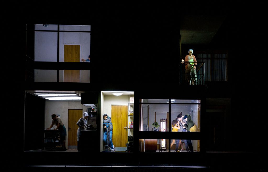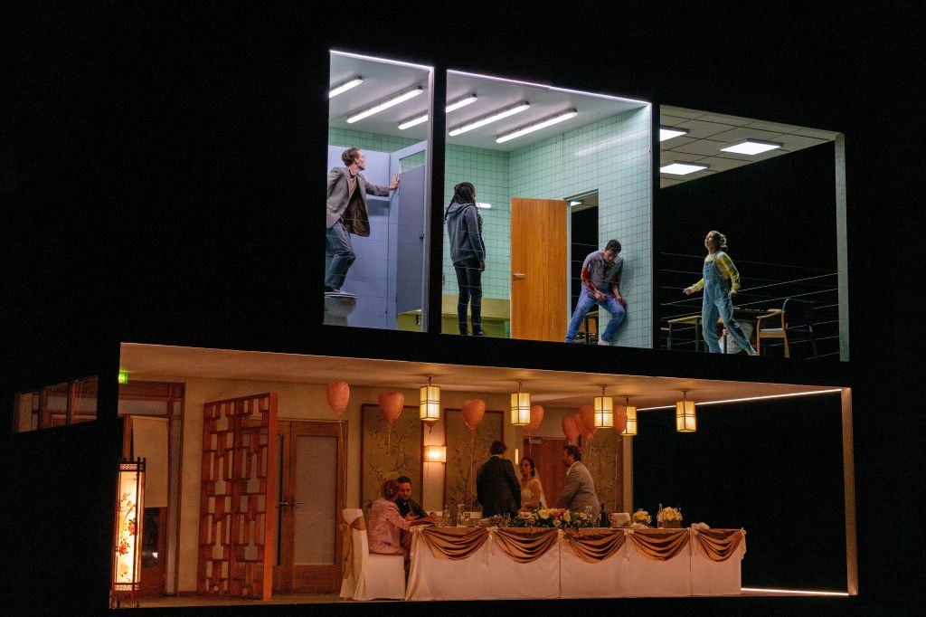 In dat opzicht is het decor in stijl. Het is een draaiende kubus met in de vier zijwanden de feestzaal, de keuken, het klaslokaal van de school, de hal van de school, de wc van de school waar leerlingen zich verstopten, de bezemkast van de school waar één leerling zich schuilhield en de deur op slot deed zodat andere leerlingen er niet meer bij konden.