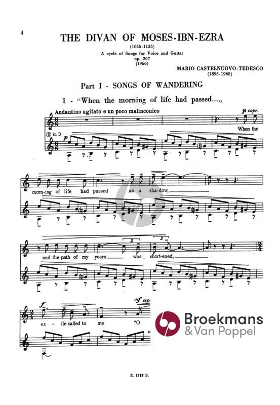 Born in Granada around 1055 – 1060, Ibn Ezra died after 1138 and is considered one of Spain’s greatest poets. He also had a huge influence on Arabic literature. Castelnuovo-Tedesco composed the ‘Divan’ (meaning; a collection of poems) to the modern English translation.