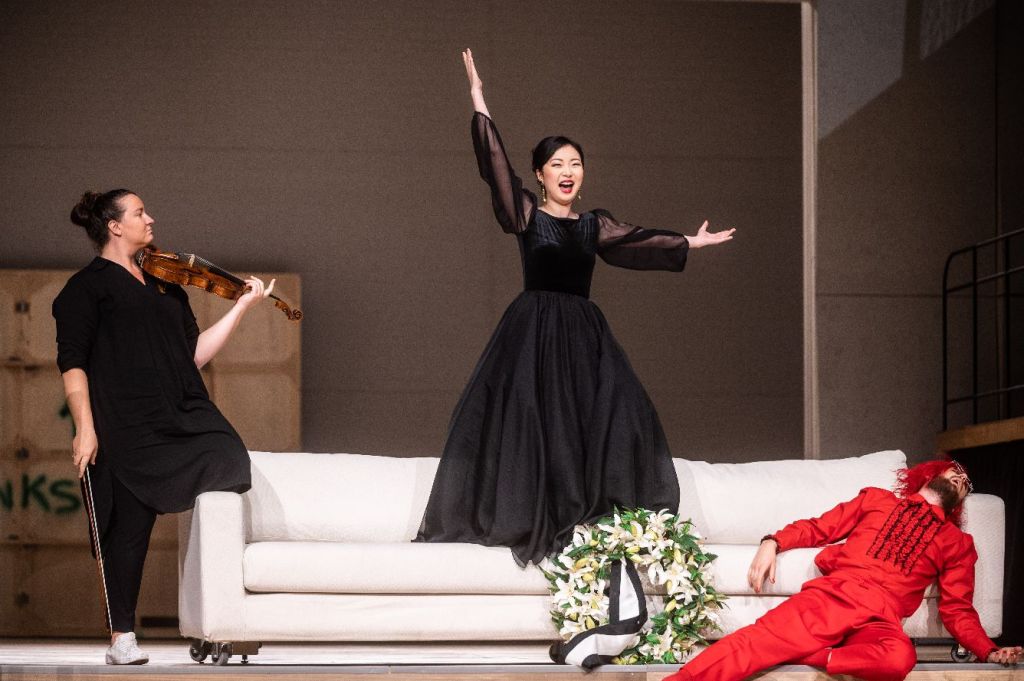 Acterend ingetogen hilarisch, zingend met fraaie topnoten en een paar coloraturen. Na de pauze had ze de vrouwelijke hoofdrol maar werd een beetje weggedrukt door het grote aantal mannelijke intriganten.