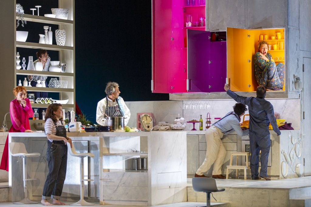 Agnes Hasun heeft als decor een grote moderne keuken ontworpen met veel kastruimte. Met die verstopplekken zit het wel goed op die manier. Hasun is tevens verantwoordelijk voor de kostumering: iedereen loopt in fleurige kledij, bij elkaar is het een feestelijk schouwspel. Tijdens de voorstelling wordt er live gekookt. De kok (Roderik Povel) wordt zo nu en dan even in de handeling betrokken, leuk gedaan